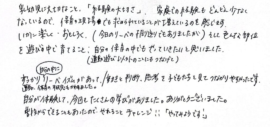 乳幼児期に大切なこと、「経験の大切さ」家庭での経験もどんどん少なくなっているので、保育の現場でも求められていることが増えているのを感じます。いかに楽しく、面白く(今日のリーベの振り返りでもありましたが)そしていろんな部位を遊びの中で育てること、自分の保育の中(運動あそび以外のことにもつなげて)でもやっていきたいと思いました。すっかり自分の中にリーベイズムがあって、動きと判断、思考を子どもたちを見て、つながりやすかったです。運動・体育の概念も変わりました。自分が体験して、今回もたくさんの学びがありました。ありがとうございました。普段からできることもあったので、やれることチャレンジ!!「やってみようです!」