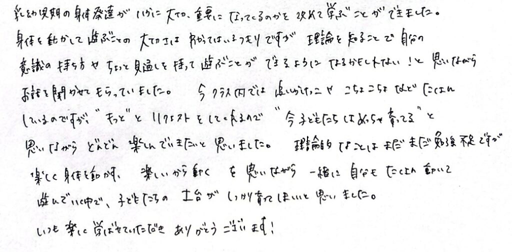 乳幼児期の身体発達がいかに大切、重要になっているかを改めて学ぶことができました。体を動かして遊ぶことの大切さはわかっているつもりですが、理論を知ることで、自分の意識の持ち方やちょっと見通しを持って遊ぶことができるようになるかもしれない!と思いながらお話を聞かせてもらっていました。今クラス内では追いかけっこやこちょこちょなど、たくさんしているのですが、「もっと」とリクエストをしてくれるので「今子どもたちはめっちゃ育ってる」と思いながらどんどん楽しんでいきたいと思いました。理論的な事はまだまだ勉強不足ですが、楽しく体を動かす、楽しいから動くを思いながら、一緒に自分もたくさん動いて遊んでいく中で、子どもたちの土台がしっかり育って欲しいと思いました。いつも楽しく学ばせていただきありがとうございます!