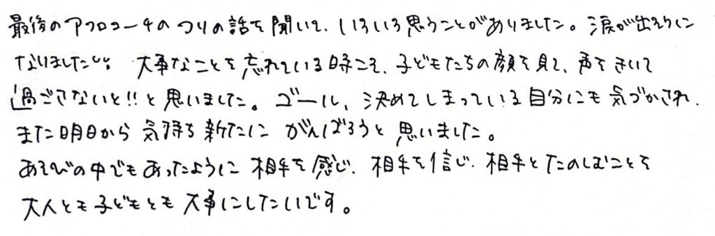 最後のアフロコーチのつりの話を聞いて、いろいろ思うところがありました。涙が出そうになりました。大事なことを忘れている時こそ、子どもたちの顔を見て、声を聞いて、過ごさないと!と思いました。ゴール、決めてしまっている自分に気づかされ、また明日から気持ち新たに頑張ろうと思いました。遊びの中でもあったように相手を感じ、相手を信じ、相手と楽しむことを大人とも子どもとも大事にしたいです。