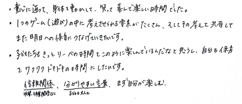 童心に返って、身体を動かして、笑って喜んで楽しい時間でした。1つのゲーム(遊び)の中に考えさせられる要素がたくさん、そしてその考えを共有してまた明日への保育につなげていきたいです。子どももきっとリーベの時間をこのように楽しんでいるんだなと思うし、自分も保育をワクワクドキドキの時間にしたいです。信頼関係、分かりやすい言葉、まず自分が楽しむ!