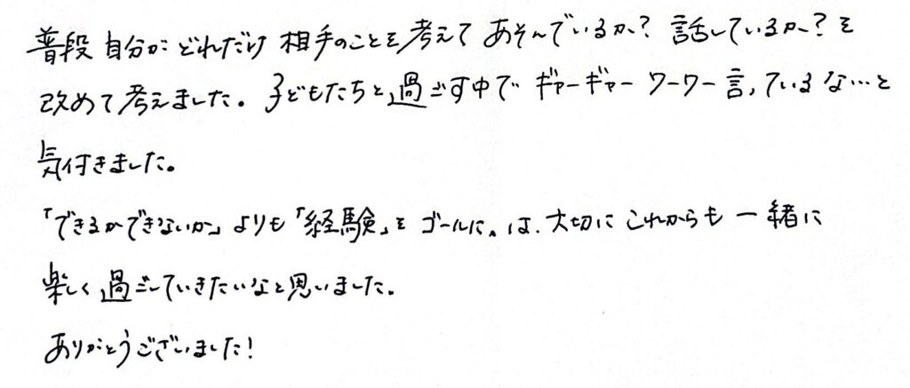 普段自分がどれだけ相手のことを考えて遊んでいるか?話ししているか?を改めて考えました。子どもたちと過ごす中でギャーギャー、ワーワー言っているな…と気づきました。「できるかできないか」よりも「経験」をゴールには、大切にこれからも一緒に楽しく過ごしていきたいと思いました。ありがとうございました!