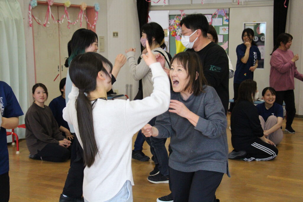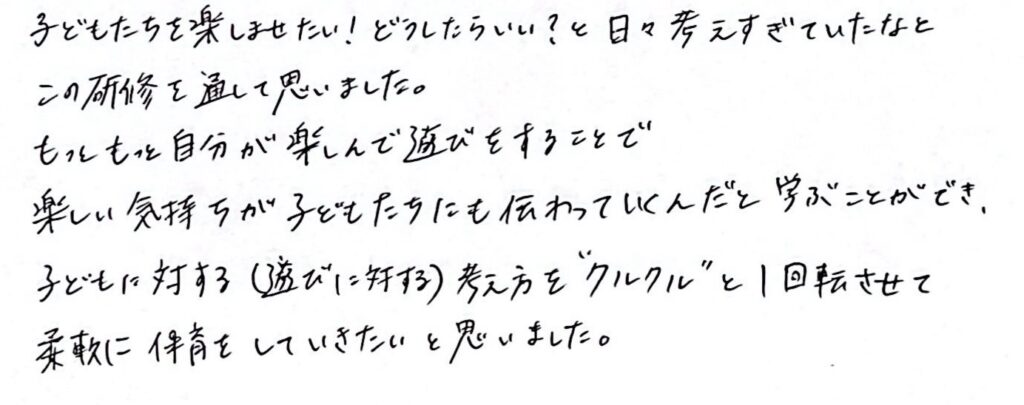 子どもたちを楽しませたい!どうしたらいい?と日々考えすぎていたなとこの研修を通して感じました。もっともっと自分が楽しんで遊びをすることで、楽しい気持ちが子どもたちにも伝わっていくんだなと学ぶことができ、子どもに対する(遊びに対する)考え方を”クルクル”と1回転させて柔軟に保育をしていきたいと思いました。