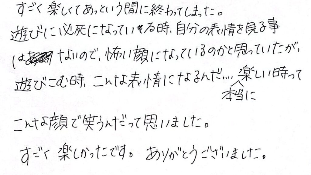 すごく楽しくて、あっという間に終わってしまった。遊びに必死になっている時、自分の表情を見る事は無いので、怖い顔になっているかと思っていたが、遊び込むとき、こんな表情になるんだ…本当に楽しい時ってこんな顔で笑うんだって思いました。すごく楽しかったです。ありがとうございました。