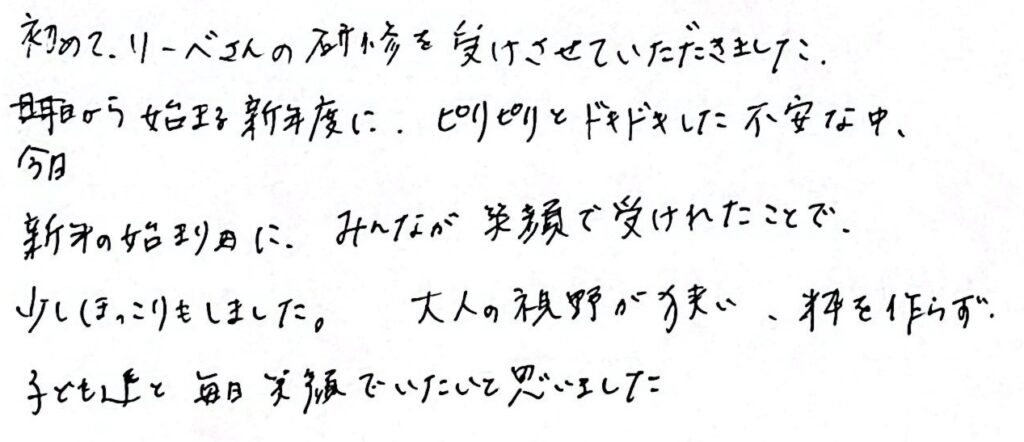 初めて、リーベさんの研修を受けさせていただきました。今日から始まる新年度にピリピリとドキドキした不安な中、新年の始まりにみんなが笑顔で受けれたことが少しほっこりしました。大人の視野が狭い、枠を作らず、子どもたちと毎日笑顔でいたいと思いました。